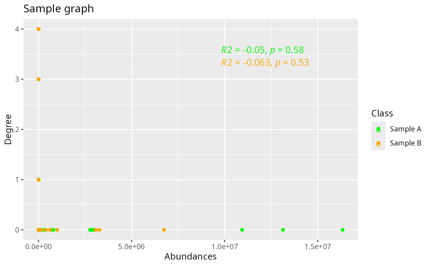 Returns a correlation plot between the degree and abundance of each node. It shows the R-square and p-value.